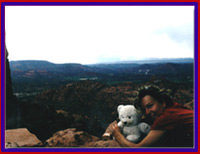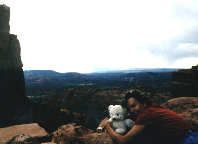 Looking down, we could see for miles in both directions. Truly a wonder. We were welcomed to the spot by a white tedy bear that someone had left behind. The view of the valley was unbelievable, made even more striking by the backdrop of red rocks Sedona is so famous for. It was such a majestic sight that we could have stayed forever, but the wind had picked up and storm clouds were looming.