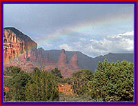 Fortunately, the trip down was not as treacherous as we thought it would be. We manuvered the rocks easily and arrived at the trail head just as the rain started. The sun was still out and two beautiful rainbows appeared. We drove like maniacs trying to find a good picture spot as the two ends of the rainbow were in front of rock formations. We have never seen anything so stunning.