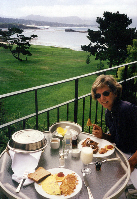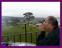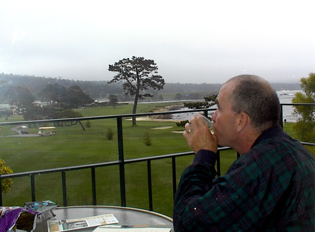 Right after our round, we visited the Tap Room to catch the U.S. Open. There was big news around the Pebble Beach Resort. New owners had purchased the property and all the local news reporters were there. Fred got himself on TV. As we were sitting the the Tap Room, we saw the reporter broadcasting live right outside the doors. Fred hopped out of his chair and as I watched the TV, he walked out the door and across the lot right behind the reporter. It was so funny.