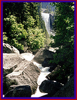 Our hike started with a steady up hill climb. We broke into a light sweat as we kept a vigorous pace. The trail wound along the Merced River which flowed merrily over the rocks on its journey to the valley floor. We could hear the river more often than we could see it; a wonderful accompaniment to our hiking. Eventually, with a small downward turn, the path reached a footbridge. Looking up, we were transfixed at the sight of the Vernal Falls tumbling 317 feet toward us. The top of that falls was our destination.
