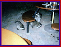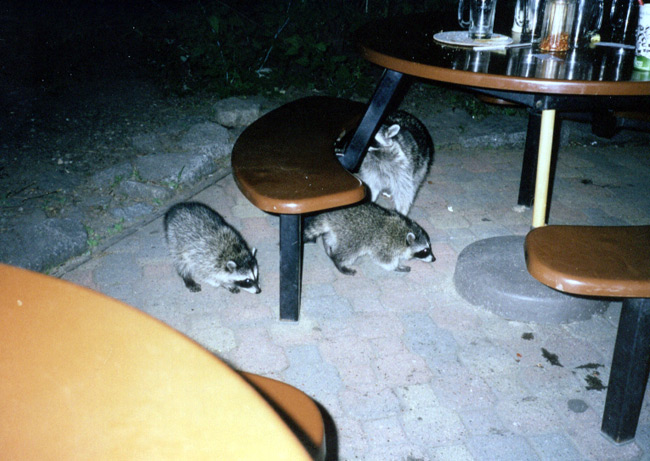 We had not eaten since lunch, so after the talk we hustled over to the outdoor pizza place. As we were sitting on the deck eating, we were delighted by the sight of a raccoon sneaking out of a grassy area. She stopped in the middle of the sidewalk, looked around, saw the coast was clear and signaled for her two babies who came scurrying along behind her. They were so adorable with their cute bandit faces and fat little round butts as they hurried across the sidewalk. What a sweet scene to witness-mother protecting her babies. They were soooo cute.
