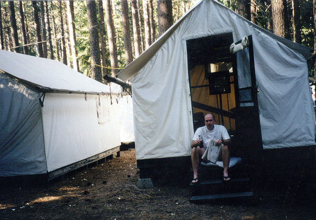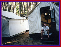 We arrived at Camp Curry and checked into our tent cabin. A canvas tent, on a platform, with two cots inside is as close as I care to get to roughing it. Hey, where is the bathroom? Where is the outlet for my hair dryer and curling iron? Where are the showers? Time to be nature girl.