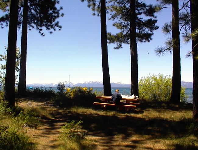 We opted to buy sandwiches for lunch and find a place along the lake for a picnic. We lucked into the Kings Beach Recreation Area and a picnic table directly beside the lake. It was beautiful. Our table was in the trees with a direct view of a sailboat on the lake.