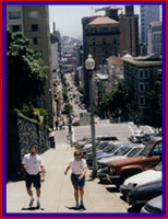One hundred and sixty nine steps lead from the street up to Coit Tower for those crazy enough to walk. Coit Tower was named for Lilly Coit who must have been one interesting lady. As a child she was mascot of the fire company and as an adult smoked cigars and dressed like a man so she could gamble. This was back in the early 1900's. When she died she bequethed money to commemorate "this beautiful city I love so much". From the tower, you can view the entire city.