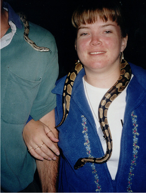 We had no trouble taking the BART back to San Francisco and stopped at Polly Esther's for a Web Group Retro Party. Heidi and Tara had snagged some free tickets to get in. A guy was walking around with two snakes around his neck and Heidi was brave enough to put one around her neck for a picture.