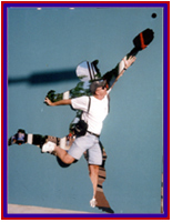 Inside, a dome is a dome is a dome. However, the blue seats and bright green turf make a good first impression until you look up and see the big white balloon covering the ceiling. During the game, a pop up actually hit the ceiling, but the Toronto second baseman judged the angle and caught it. It is kind of like playing in our indoor volleyball league where we have to contend with the basketball ropes.