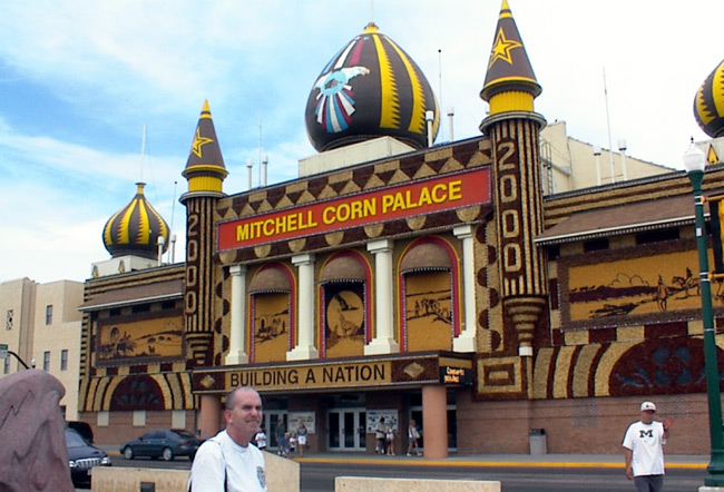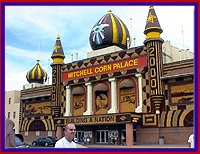 Last stop for the day--the Corn Palace of Mitchell, South Dakota. Fred had read about the Corn Palace in Roadside America-Guide to Tourist Attractions and had been joking about it ever since. We had no idea what to expect, but we had to stop for a corny picture. To some this building could be cornstrued as hoky, but it was quite impressive.