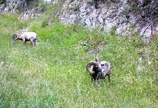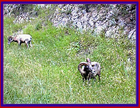 Still in complete euphoria over what we had just witnessed, we were delighted a few miles later with three big horn sheep grazing by the side of the road. I spotted them first and started babbling to get Fred to stop the car. They looked positively regal as they stood on the side of the hill with their round horned heads held high.
