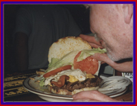 Fred ended up winning $20.00. Instant Celebrity! Fred was then challenged to order the special sandwhich. A gigantic burger with 2 kinds of cheese and 2 fried eggs on top! Since he was the "Bingo Champion" he had to go for it. 2 million calories and 5000 grams of fat later he did it! I was so proud of my man.