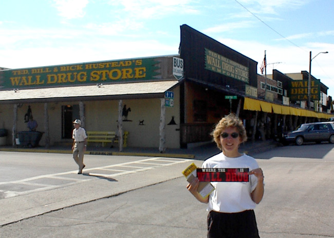We did indeed beat the bus, but only by a few moments. At Wall Drug, we picked up our free bumper sticker, free water and five cent coffee, but opted out of the shopping and animatronic dinosaur. What used to be a small drug store, now occupies the majority of downtown Wall.