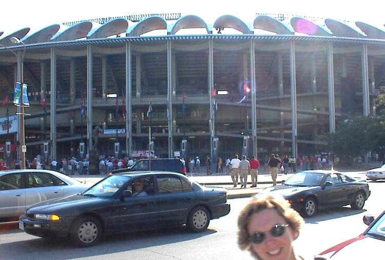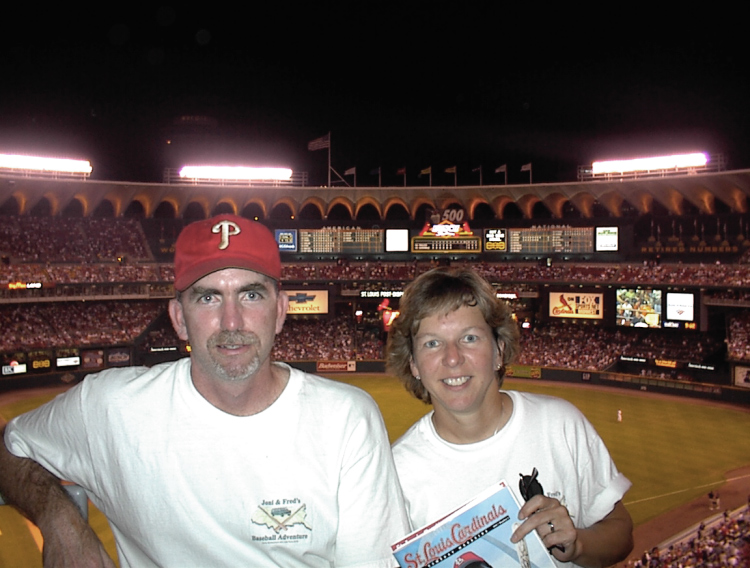 Big Mac Mania is evident all around town. He received a standing ovation every at bat but did not hit any homeruns. Over 40,000 fans attended the game and they were extremely enthusiastic. J.D. Drew received applause every at bat and Ron Gant (used to be a Cardinal, now a Phil) got booed. The Phillies had every chance to win the game but handed it over to the Cardinals with one lousy inning in the 6th. Final score St. Louis-4, Phils-3. Fred wore his Phillies hat but did not receive any abuse from the "Drew Crew". (Fans carried red Drew Crew signs) . Surprisingly, we did not see any other Phillies fans during the game.