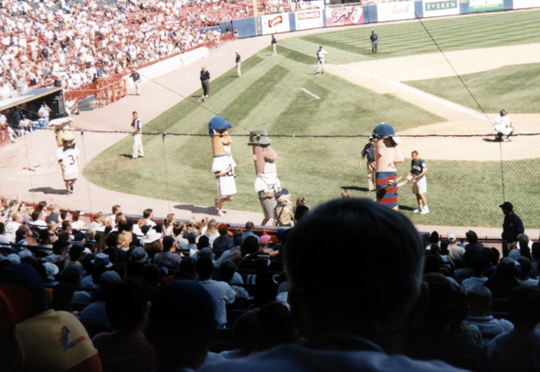 the hot day. Toward the end of the game, we moved down to some empty seats about 15 rows behind home