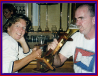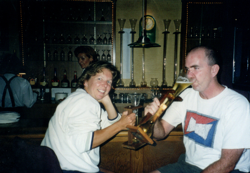 Kelly's Pub was our next stop. We knew right away that we liked this place. There was a good crowd of people, good music, the football game was on the big screen, and there was a walk up pizza window. Getting people to take our pictures seemed to be a great catalyst for getting to meet some of the locals at the bar. It was neat to see how interested people were in Joni and Fred's trip and how eager they were to offer their advice. It was actually someone that we met at Kelly's, his name was Terry, that advised where to go for the required Kansas beer that we were planning to consume Sunday morning. Westport seemed to be a happening area of town so we didn't want to spend too much time in one bar and we opted to move on. We had been asking around for directions to Lynn Dickie's but no one seemed to know where it was, we became determined to find this bar.