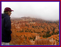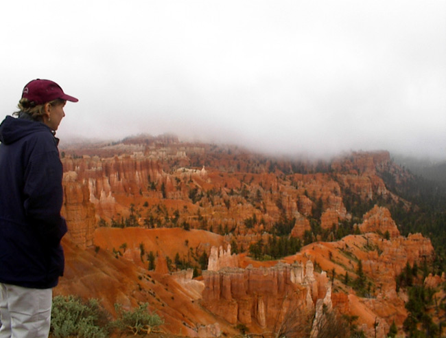 We awoke to the sound of rain and no electricity in the cabin. There would be no sunrise this morning. We packed up and walked down to the rim to take one last look at the hoodoos. Thank goodness we had gotten in early yesterday and been able to hike and see the park because today it was nasty. We really wanted to hike down the Navajo Loop trail again because it had made such an impression on us yesterday, but thought better of it. Hiking back up in the pouring rain would not be much fun. However, Bryce Canyon is definately a must return destination for us and we have a date for the future to see a sunrise there.