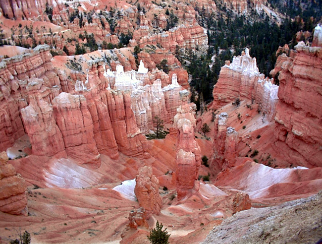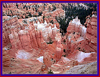 Bryce Canyon is not really a canyon, but a series of amphitheaters carved out of the Paunsaugunt Plateau. The Indian legend says that the Towhenanungwa lived in the canyon in the form of animals, lizards and birds and they were so bad that the Coyote turned them all into rocks. You can see them now, all turned into rocks, some standing in rows, some sitting down, some holding onto others. You can see their faces, with paint on them just as they were before they became rocks.