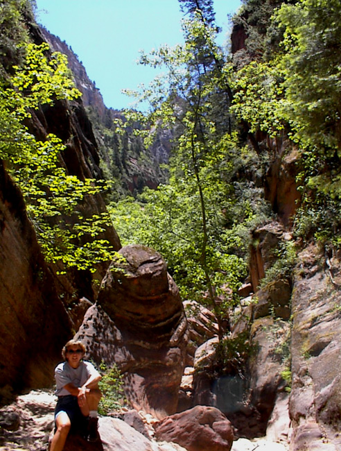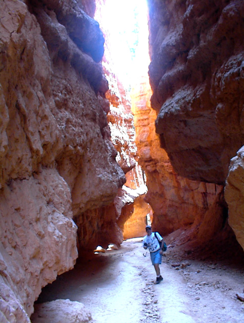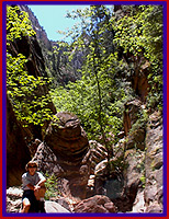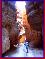 Here the trail eventually goes down into the "hidden canyon". At times we felt like we were walking on the beach, there was so much sand on the canyon floor. We alternated between hiking in the sand and scrambling over and around rock formations. We were doing great until Fred's foot slipped. He gave both of us a scare. Sand from erosion of the sandstone covered the rocks we were climbing over and made them extremely slippery. After that, I had some trouble but finally made it through another scary spot. However, another 1/2 mile of strenuous scrambling and we were done. Our sensible side, or maybe it was the shaky legs and sore ankles, got the better of us and we turned back. It was indeed time.