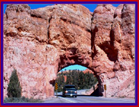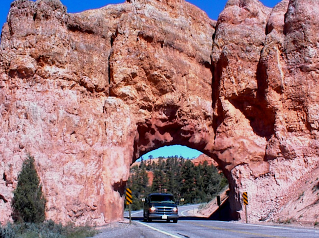 Slabs of red rock, all shapes and sizes, piled high on top of each other came into view on both sides of the road. Two arch-like tunnels through the rocks provided passage for the Big Kahuna. We were fascinated by this mini canyon and giddy with anticipation of things to come. Each National Park is a new and exciting adventure.