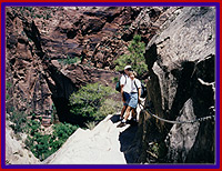 After a brief stop at the visitors center to fill up our water bottles, we headed out to the Hidden Canyon trail. The trail started out easy on a paved walkway, but was a continous up-hill climb. We were soon huffing and puffing, but kept a steady pace.