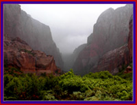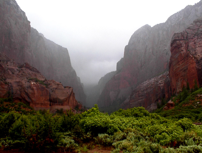 We stopped at the upper end of Zion and drove the 5 mile scenic trail. Huge finger canyons loomed behind the fog. Visibility was limited but the view was incredibly pretty in a shadowy sort of way.