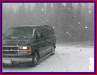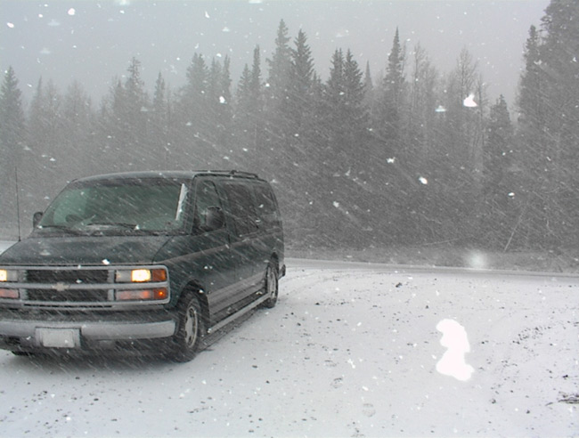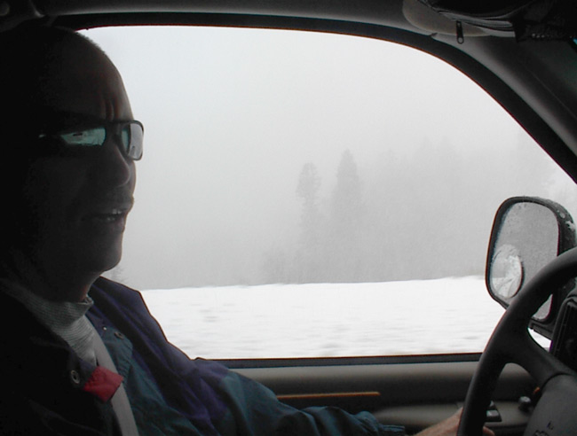 As we begin to slide off to the right, we realize that the road surface is no longer snow, but ice. Fred is fighting for control of the BK. We are scared now. His knuckles are white on the steering wheel and I am holding on for dear life. In my mind, I see us going over the cliff and in stunt man style bailing out just as the BK plunges 1,000 feet taking all of our stuff along. Of course, at this point in time, I do not share my day-mare with Fred. After several harrowing attempts, Fred gets the BK back on the road. Slowly we crawl along and after what seems like forever, we descend into lower elevations and the snow changes back to rain. What a weird experience.